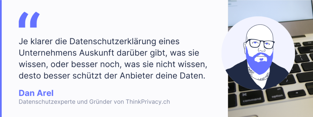 Also: Je klarer die Datenschutzerklärung eines Unternehmens Auskunft darüber gibt, was sie wissen, oder besser noch, was sie nicht wissen, desto besser schützt der Anbieter deine Daten.