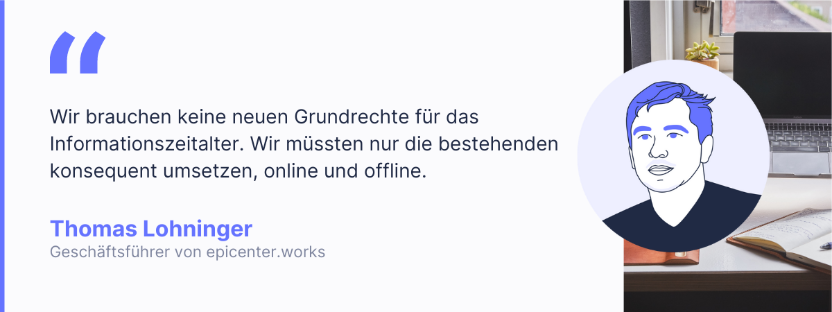 Thomas Lohninger ist Geschäftsführer der netzpolitischen Bürgerrechtsorganisation epicenter.works in Wien. Er war Senior Fellow der Mozilla Foundation für Netzneutralität in Europa und ist non-residential Fellow des Center for Internet and Society der Stanford Law School. Thomas hat für European Digital Rights (EDRi) als Policy Advisor an dem EU Gesetz zur Netzneutralität gearbeitet und ist seit 2019 im Vorstand von EDRi und seit 2020 deren Vize-Präsident. Sein Hintergrund ist in der IT und Kultur- und Sozialanthropologie zu finden und gelegentlich podcastet er bei Logbuch Netzpolitik. Hier könnt ihr ihm bei Twitter folgen.