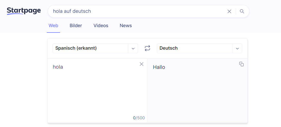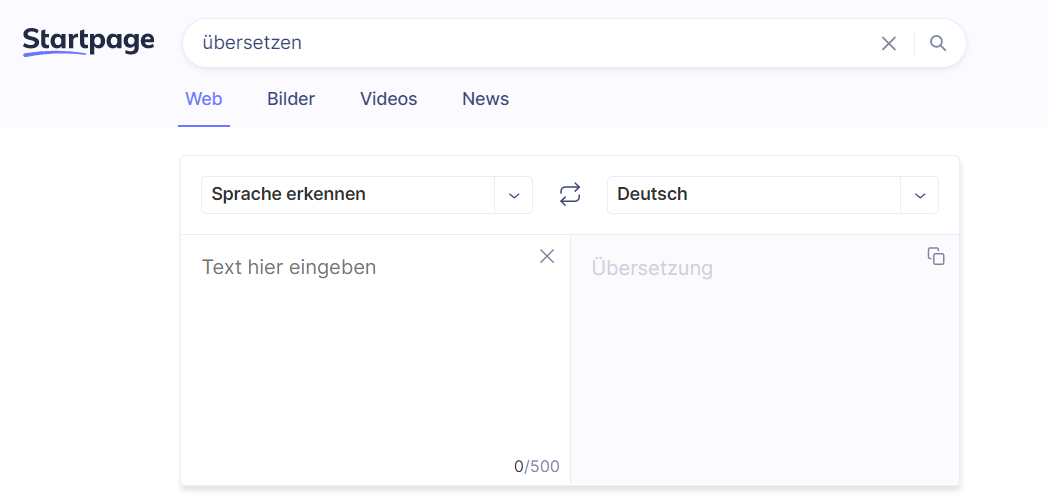 Ab heute unterstützt die neue Funktion die automatische Erkennung von 109 Sprachen und wird durch die Eingabe von “übersetzen” in das Startpage-Suchfeld aktiviert.