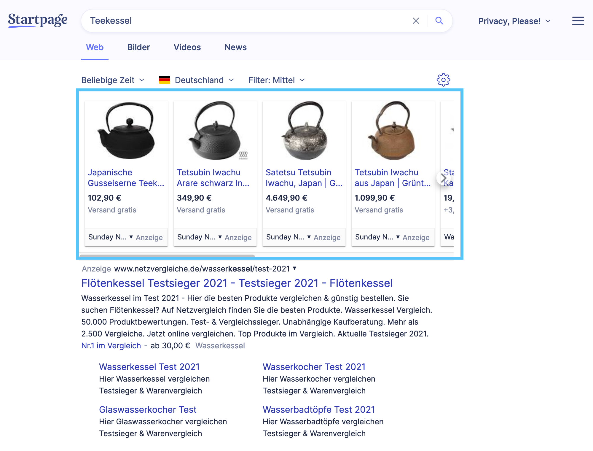 Bei Startpage sind wir stets bemüht, das Sucherlebnis unserer Nutzer zu verbessern. In den letzten Monaten haben wir viele Fragen darüber erhalten, wie man fair und anonym nach Produktangeboten suchen kann. Wir freuen uns, jetzt eine Lösung zu präsentieren. Dafür haben Wir haben wir unser Anzeigenkonzept aktualisiert und bieten nun auch direkte Kaufmöglichkeiten an.