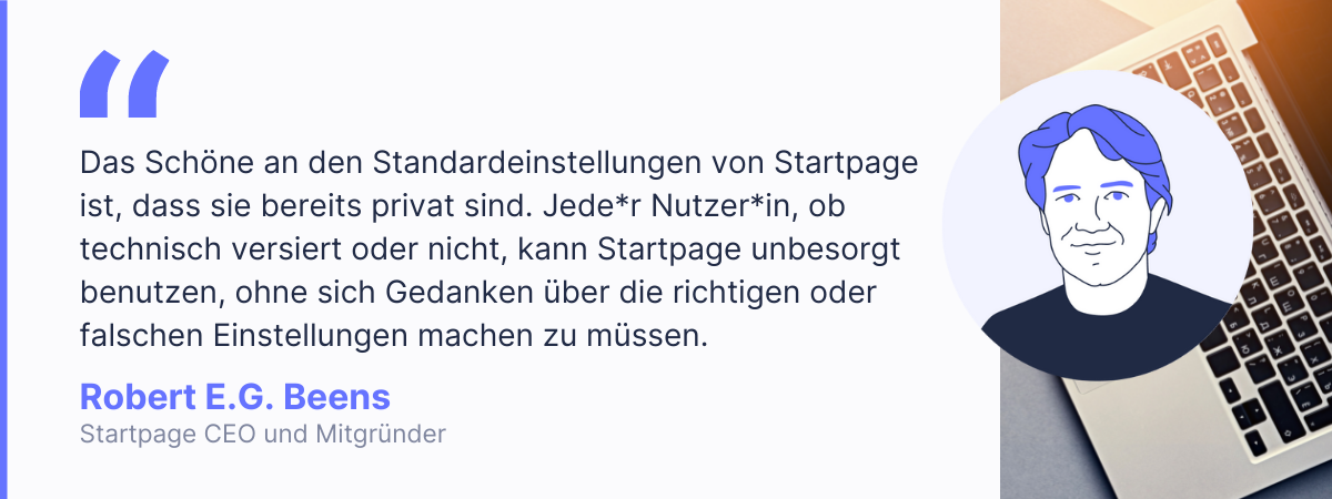 “Das Schöne an den Standardeinstellungen von Startpage ist, dass sie bereits privat sind. Jede*r Nutzer*in, ob technisch versiert oder nicht, kann Startpage unbesorgt benutzen, ohne sich Gedanken über die richtigen oder falschen Einstellungen machen zu müssen.”