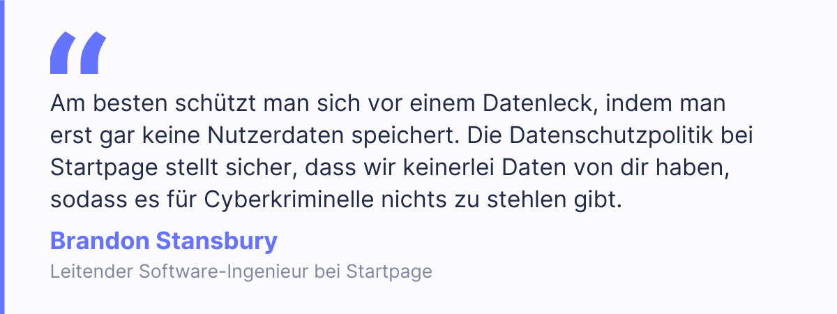Brandon Stansbury ist leitender Software-Ingenieur bei Startpage und erklärt, warum die sparsame Datenverarbeitung für mehr Cybersicherheit sorgt: “Die Privatsphäre von Nutzer*innen wird besonders schwer geschädigt, wenn ein Unternehmen, das Daten speichert, eine Datenpanne erleidet. Am besten schützt man sich gegen ein solches Datenleck von Nutzerdaten, indem man erst gar keine Nutzerdaten speichert. Die Datenschutzpolitik bei Startpage stellt sicher, dass wir keinerlei Daten von dir haben, sodass es für Cyberkriminelle nichts zu stehlen gibt.”