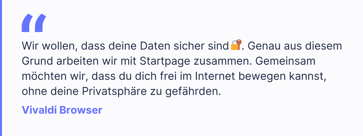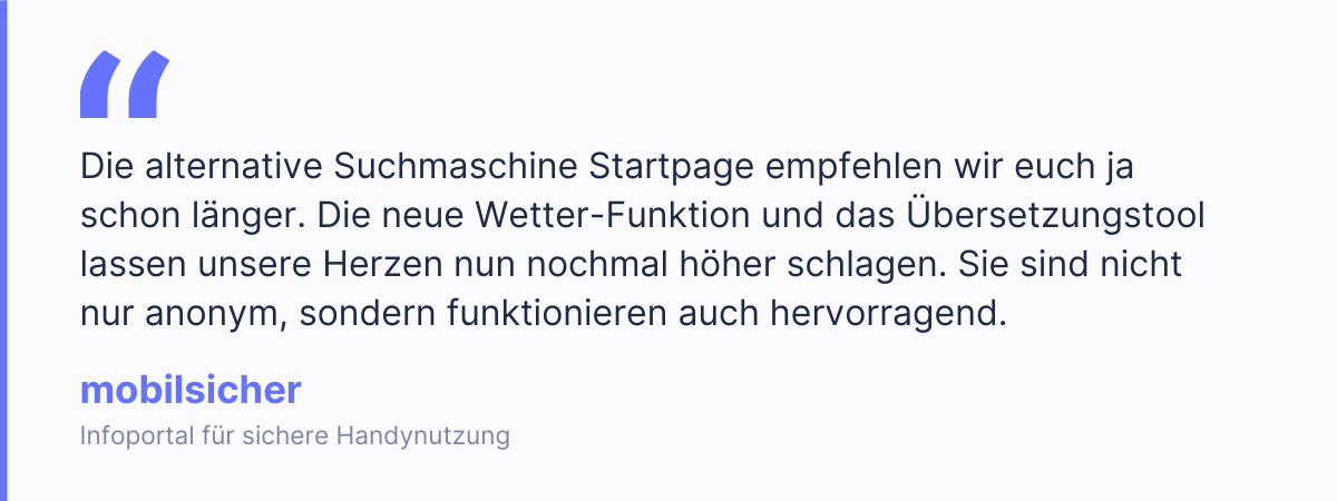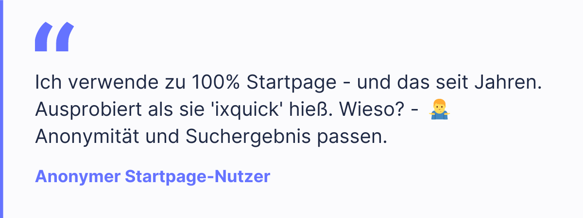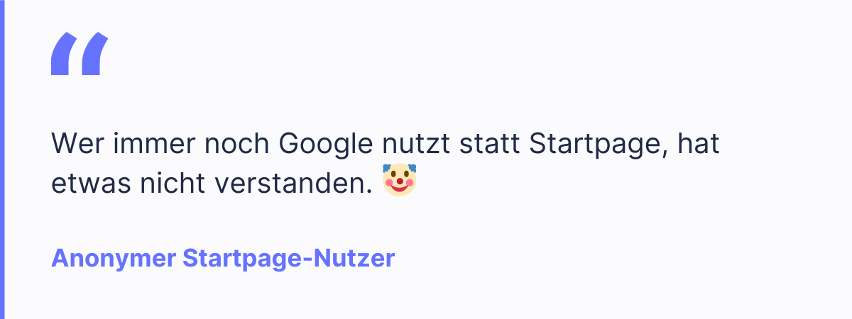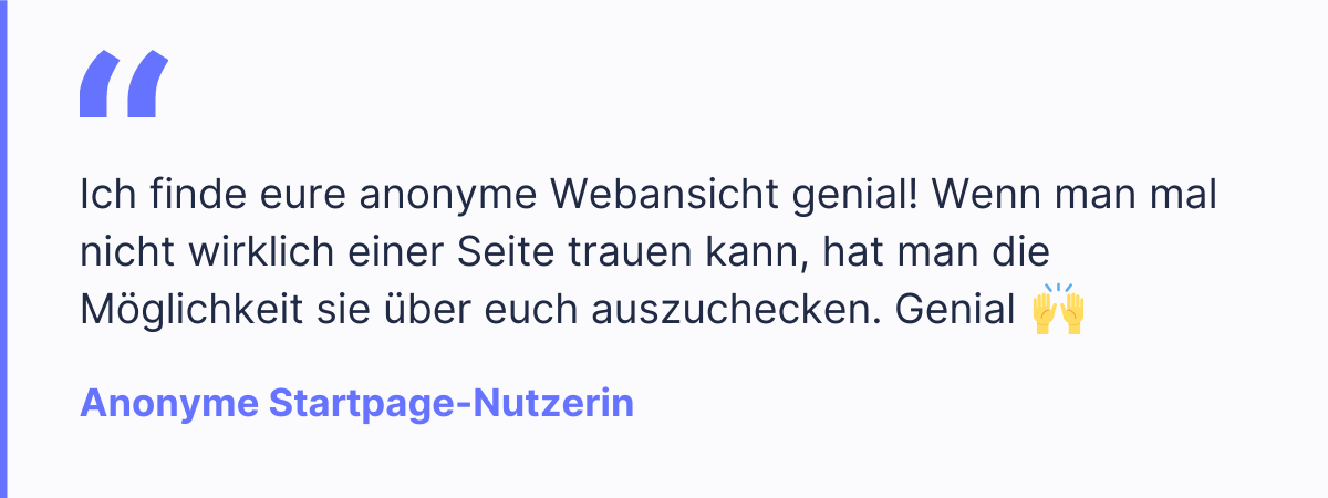 In unserer 15-jährigen Geschichte haben Nutzer*innen wie ihr enorm dazu beigetragen, Startpage erfolgreich zu machen. Durch euer Feedback und eure Unterstützung wart ihr enge Verbündete im Kampf für mehr Datenschutz. Wir haben einige der Zitate anonym gehalten, um die Privatsphäre der Startpage-Nutzer*innen zu schützen.