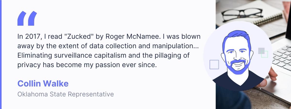 Rep. Collin Walke: I grew up in Oklahoma, a state known more for cowboys and oil than technology. As a result, I was like most Americans and had no idea how data worked, nor had I ever heard the phrase “surveillance capitalism.” Then, in 2017, I read “Zucked” by Roger McNamee. I was blown away by the extent of data collection and manipulation. This was the catalyst for my passion regarding digital privacy, and it led me to reach out to Mr. McNamee to enlist his help in crafting legislation to address the problem. Eliminating surveillance capitalism and the pillaging of privacy has become my passion ever since.
