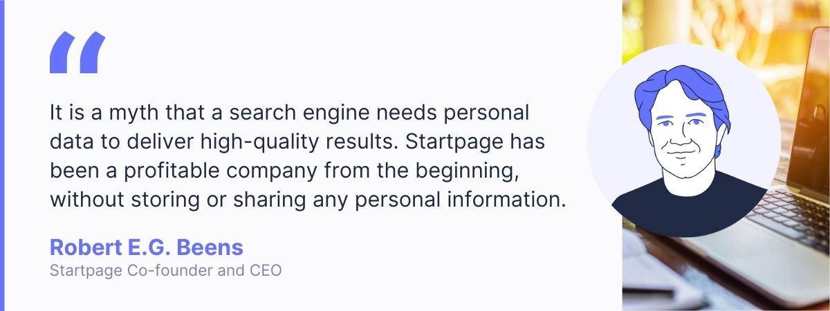 It is a myth that a search engine needs personal data to deliver high-quality results. Startpage has been a profitable company from the beginning, without storing or sharing any personal information on the people using our search engine. The revenue is generated from contextual ads that are only based on the search term. Revenue is obviously a lot lower than with non-private search engines but enough to pay the bills and allow us to continue investing in our product.