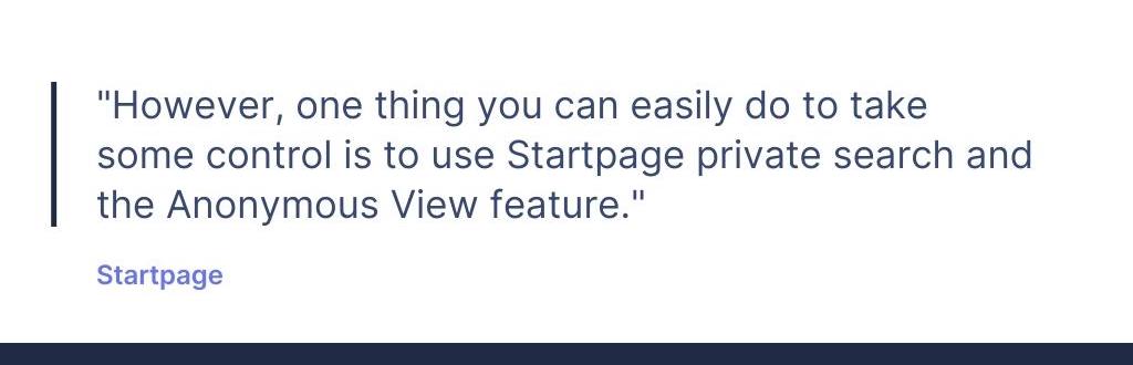 However one thing you can easily do to take some control is to use Startpage private search and the Anonymous View feature. Anonymous View is a web proxy built into our search engine. If you click on the Anonymous View link in your chosen search result, the external webpage will open in our web proxy. So if there’s JavaScript or cookies on the external site that violates privacy, the site will see our proxy, not your web browser.