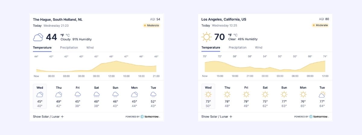 With Startpage, you can get hourly and 7-day weather forecasts along with other weather details without passing your IP address. Simply type in the desired location (city name or zip code) + weather into your search bar and the latest information will appear.