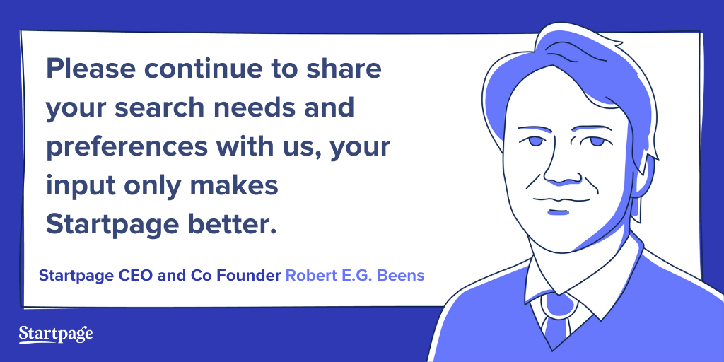 Please continue to share your search needs and preferences with us, your input only makes Startpage better. And please share the gift of privacy with your loved ones and recommend Startpage.