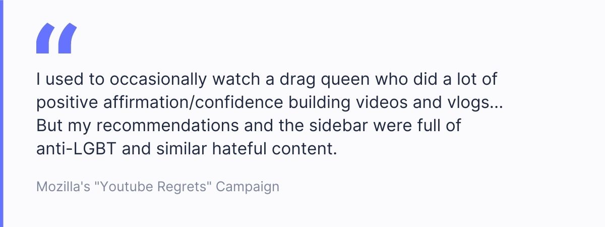 With the awareness campaign “YouTube Regrets”, the non-profit organization has collected countless stories from users in which they report on how the algorithm has permanently damaged them. Most of these user stories start with a harmless video and end with the algorithm presenting videos with alarming and mentally stressful content. Here are a few examples: