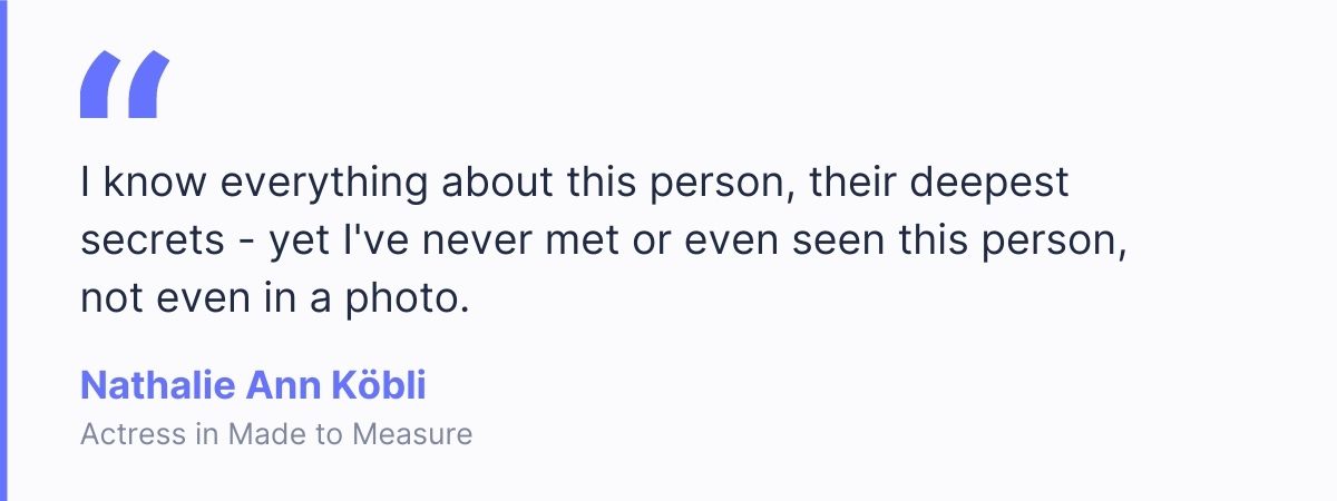 Since the results of the data analysis suggested a female data owner, actress Nathalie Ann Köbli was hired to bring the insights gained from the search queries to life. At the end of the experiment, the data donor and doppelganger would meet. Köbli had the task of sketching out the last 5 years of her life for the owner of the data and reproducing important life events and emotional states as accurately as possible. “I know everything about this person, their deepest secrets – yet I’ve never met or even seen this person, not even in a photo,” said actress Nathalie Ann Köbli after familiarizing herself with her role.