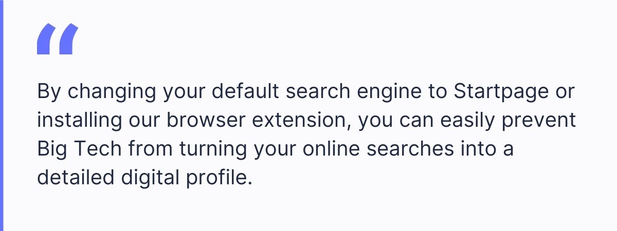 Searching anonymously can already reduce the data profile in the network considerably. By changing your default search engine to Startpage or installing our browser extension, you can easily prevent Big Tech from turning your online searches into a detailed digital profile. Startpage does not collect any search queries or personal information: no IP address, no location, no data profile. Furthermore, the ads at the top of our search results are never based on your online behavior, but only context-related on the search term you have just entered.